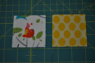 You will start building your blocks by pulling two squares of different colors and prints and sewing these right side together. Finger press your seams to the left.